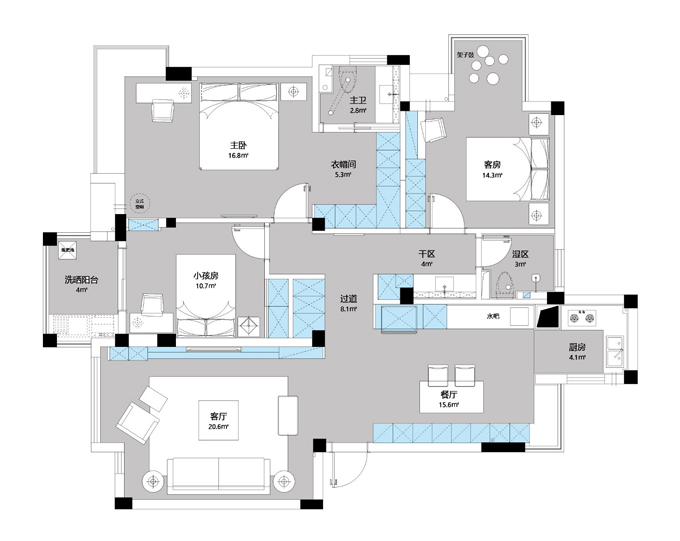 4.縮小南面洗曬陽臺,增加小孩房的面積,取消臥室和客廳的入口,從小孩房進洗衣房,這樣臥室的私密感會好很多,同時也讓小孩房和洗曬的功能更加合理。