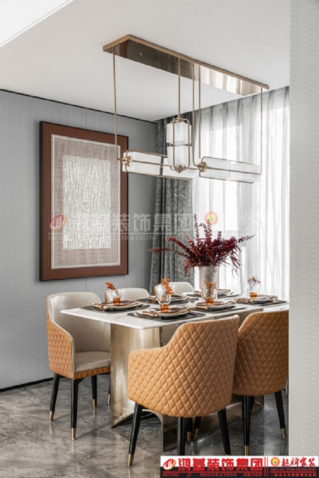 圖6亮點:清新明快的色調組合,恰到好處的材質對比,讓整體空間保持統(tǒng)一調性。背景墻掛著以水為意境的現(xiàn)代藝術畫作,在用餐空間中傳遞休閑感